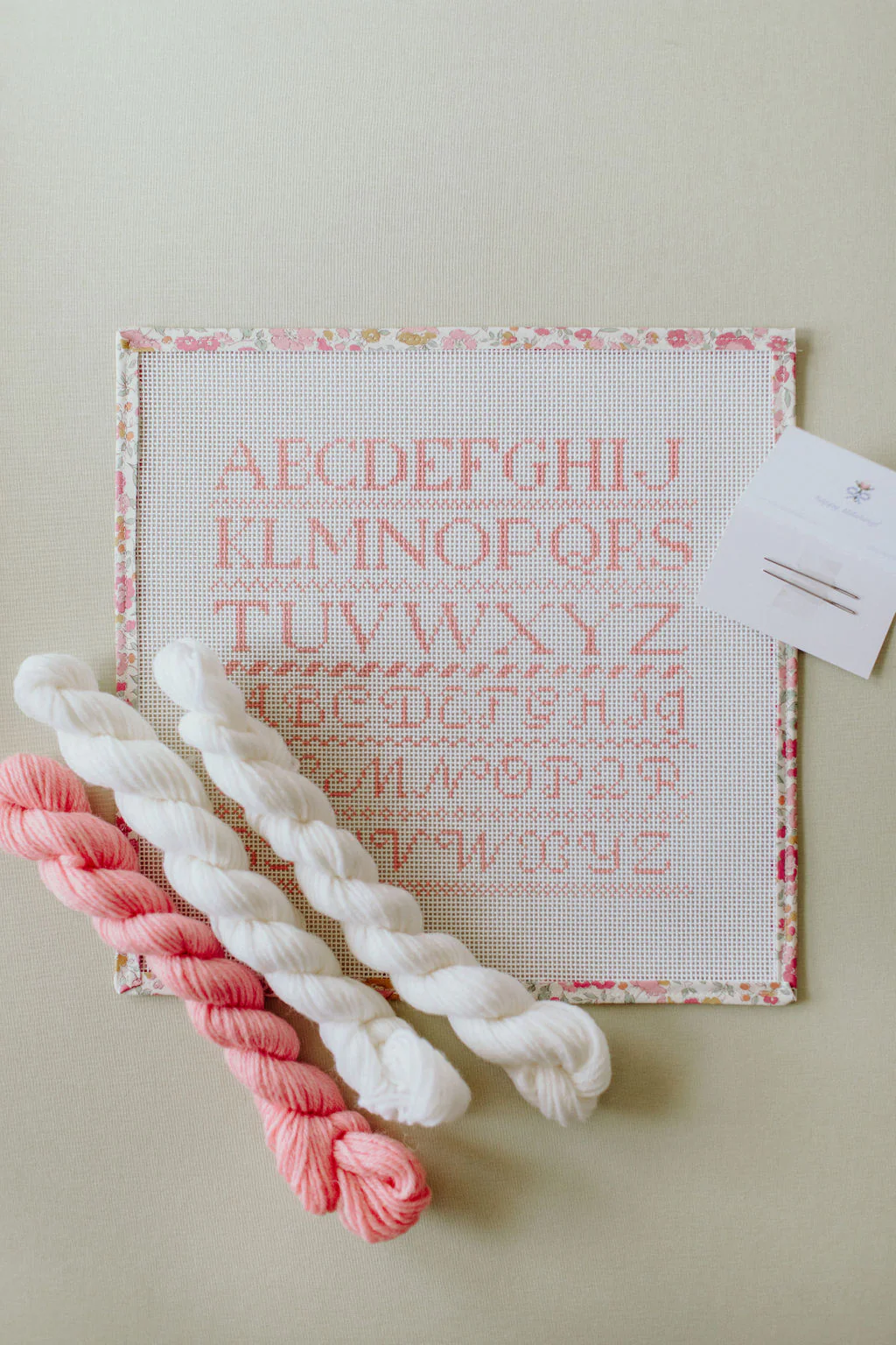 Our ABC Sampler is a beautiful 10”x 10” design, hand painted on 12 mesh canvas. Total Canvas size in 14” x 14”.