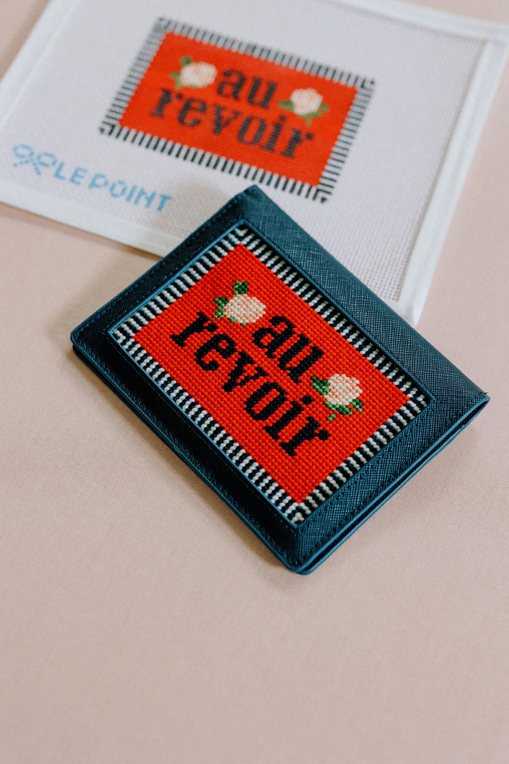 Our Au Revoir needlepoint canvas (French greeting for ‘Until we meet again’) is a beautiful 3” x 4.5” design, hand painted on 13 mesh canvas. Total canvas size is 7” x 8.5”. Designed to fit within the Rachel Barri Self Finishing Passport covers which can be purchased on rachelbarri.com.