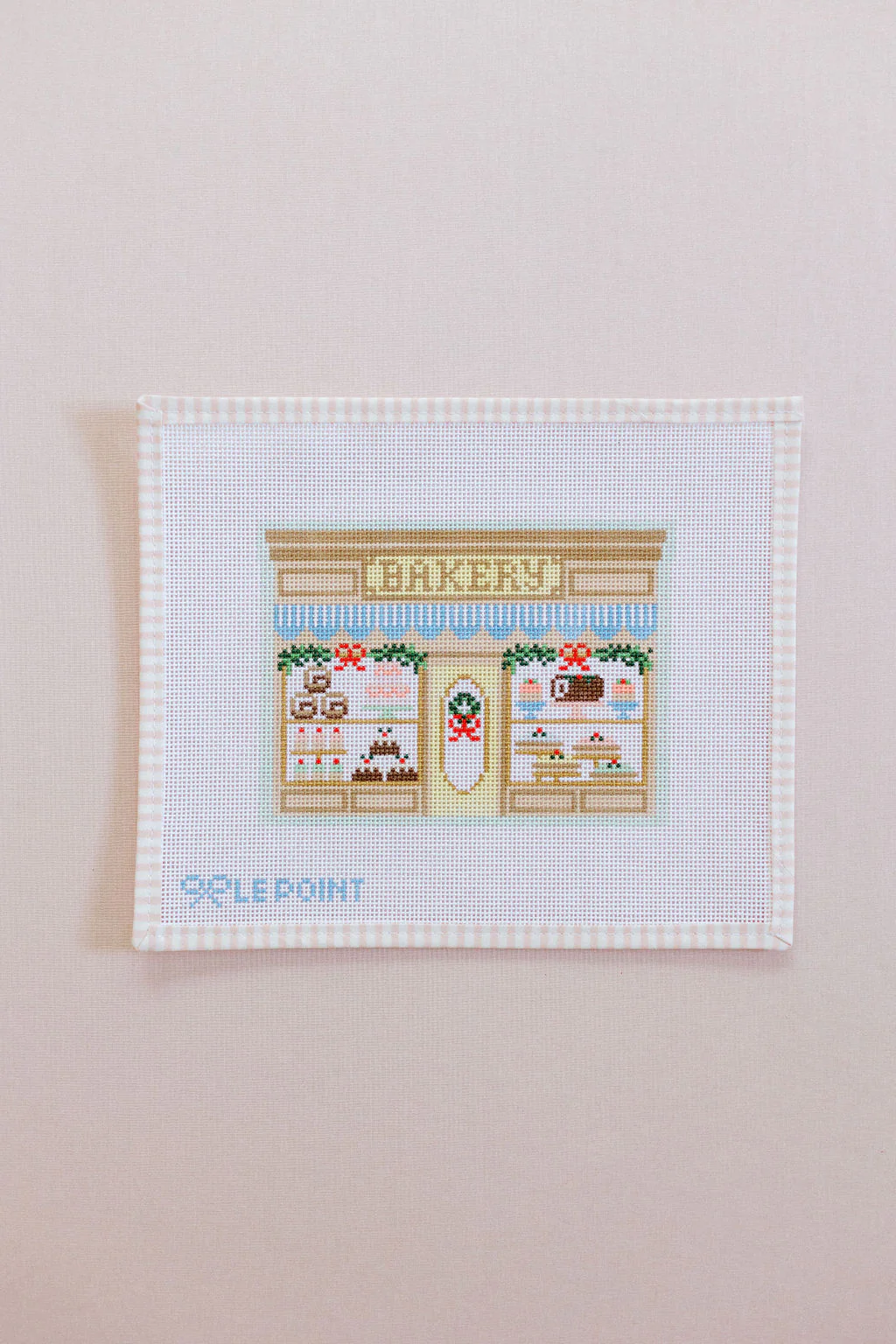 Our Christmas Village Bakery canvas is a beautiful 7” x 5.25” design, hand painted on 13 mesh canvas. Total canvas size is 11” x 9.25”.
