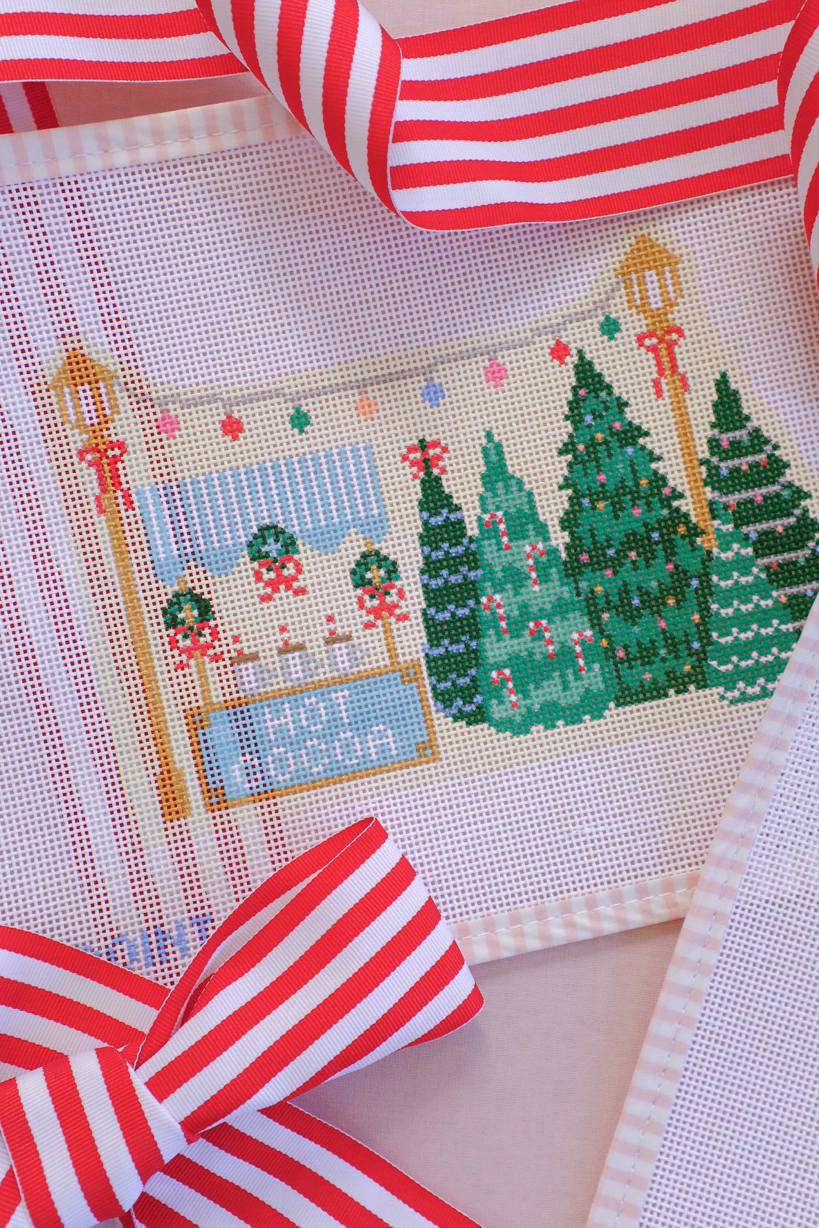 Our Christmas Village Tree Lot canvas is a beautiful 8.5” x 5.5” design, hand painted on 13 mesh canvas. Total canvas size is 12.5” x 9.5”.