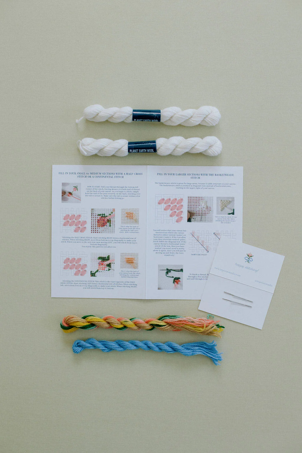 Our He is Risen needlepoint canvas is painted on 13 mesh, and measures 3.5” by 4.75”, with a total canvas size of 8” by 9“.