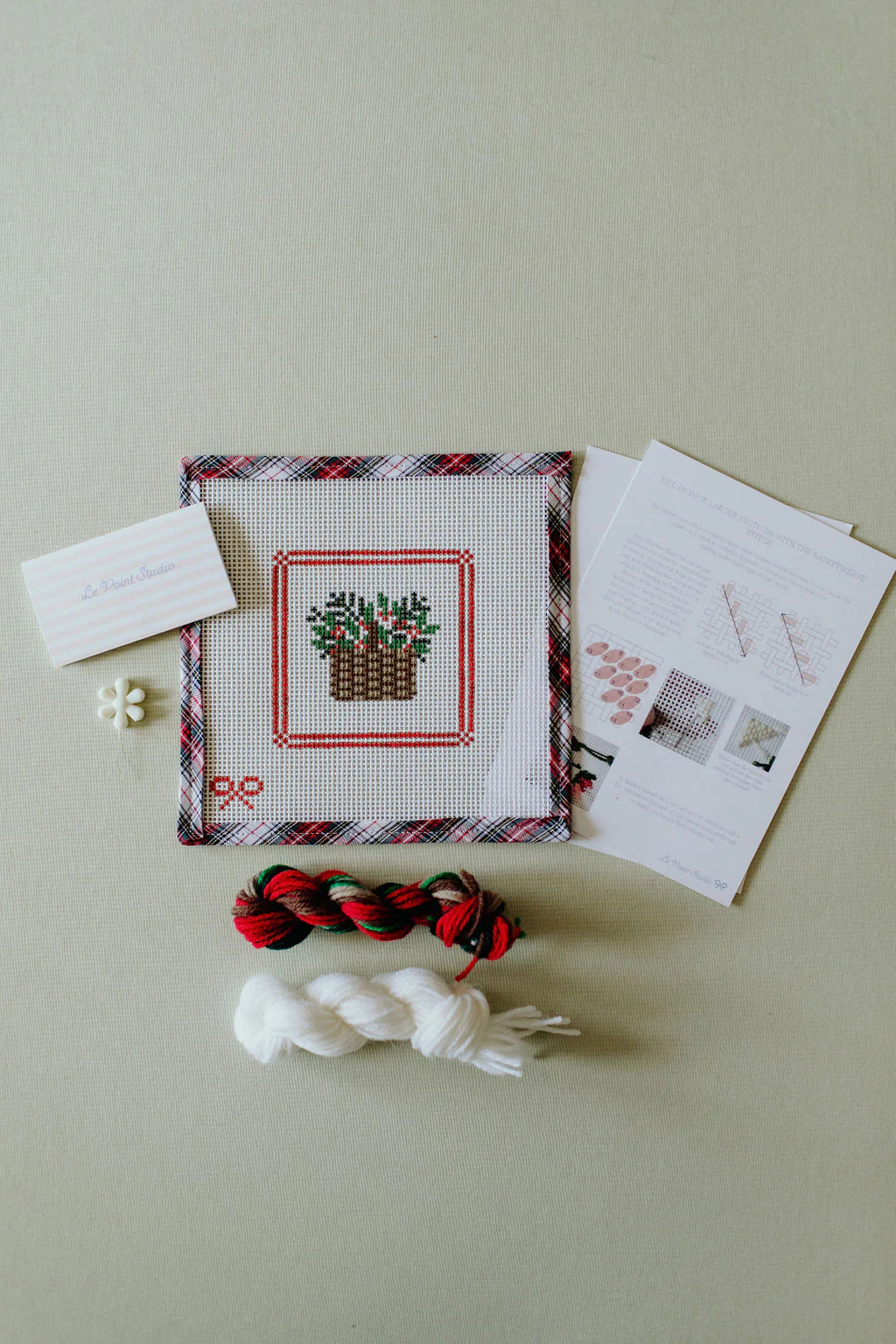 Our Holly Basket needlepoint canvas & Kit is a 4” by 4” design, hand painted on 12 mesh canvas.