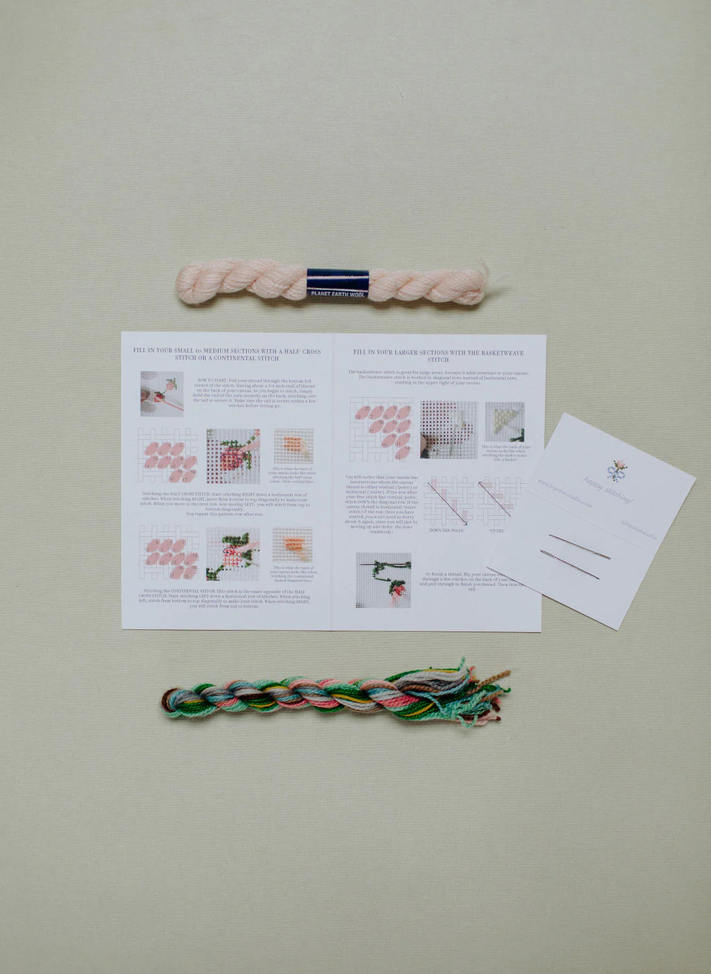 Our Robin’s Nest Egg needlepoint canvas is painted on 13 mesh, and measures 3.5” by 4.5” , with a total canvas size of 8” by 9“.